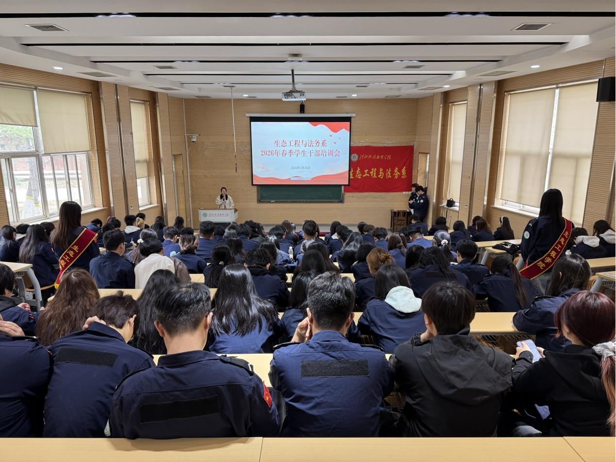 为深入推进学风建设,切实提升学生干部能力与示范引领作用,在经验交流中凝聚成长合力、夯实服务根基,生态工程与法务系于3月30日在学府校区阶梯教室组织召开春季学期学生干部培训会。